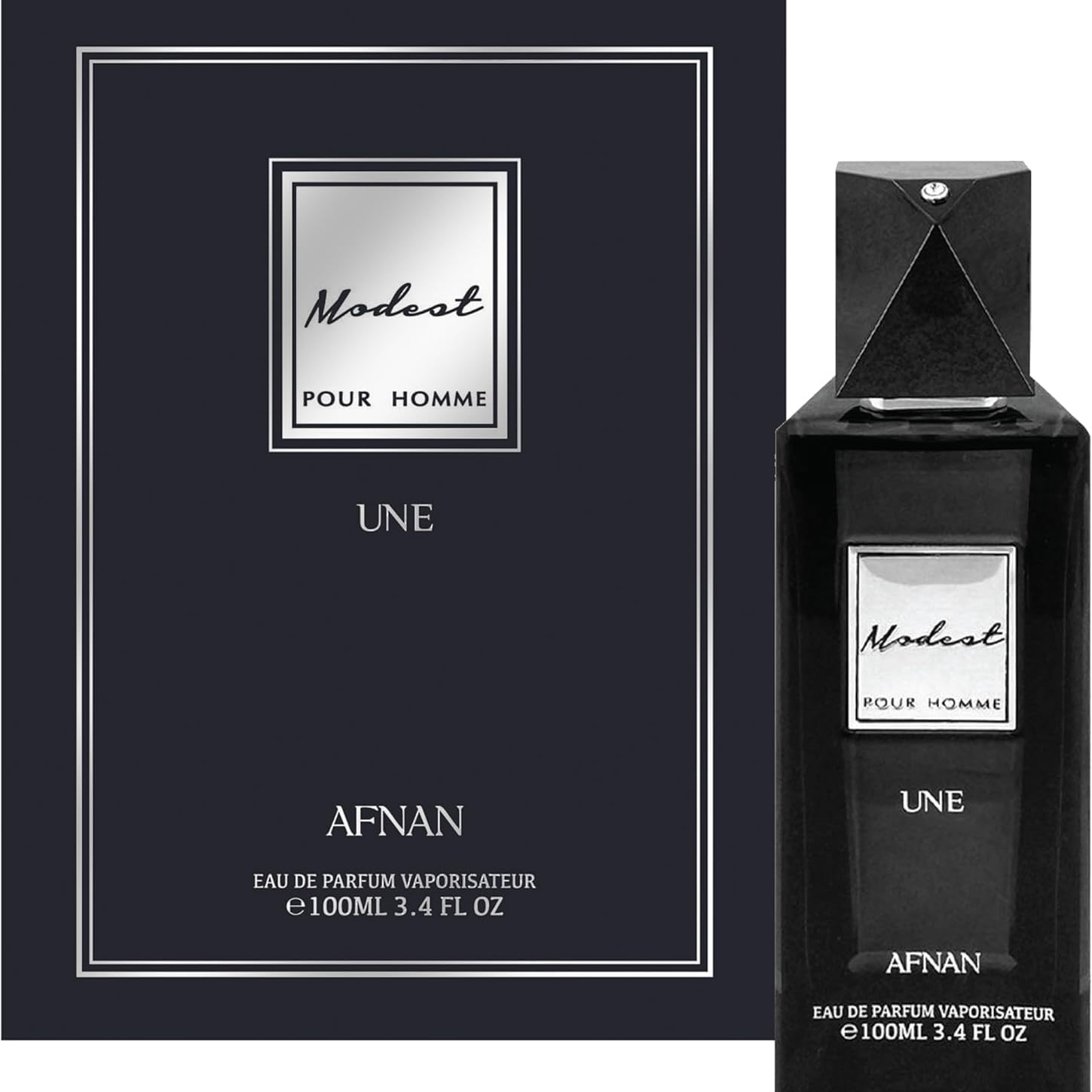 Không chỉ nổi bật về mùi hương, thiết kế của Modest Une Pour Homme cũng thể hiện rõ phong cách mạnh mẽ. Chai nước hoa được khoác lên tông đen bóng, đơn giản nhưng đầy nam tính. Các đường nét vuông vức, góc cạnh tạo cảm giác chắc chắn, vững chãi. Dòng chữ “Modest Une” màu trắng nổi bật trên nền đen, kết hợp cùng nắp chai cứng cáp, mang đến sự sang trọng và cao cấp.