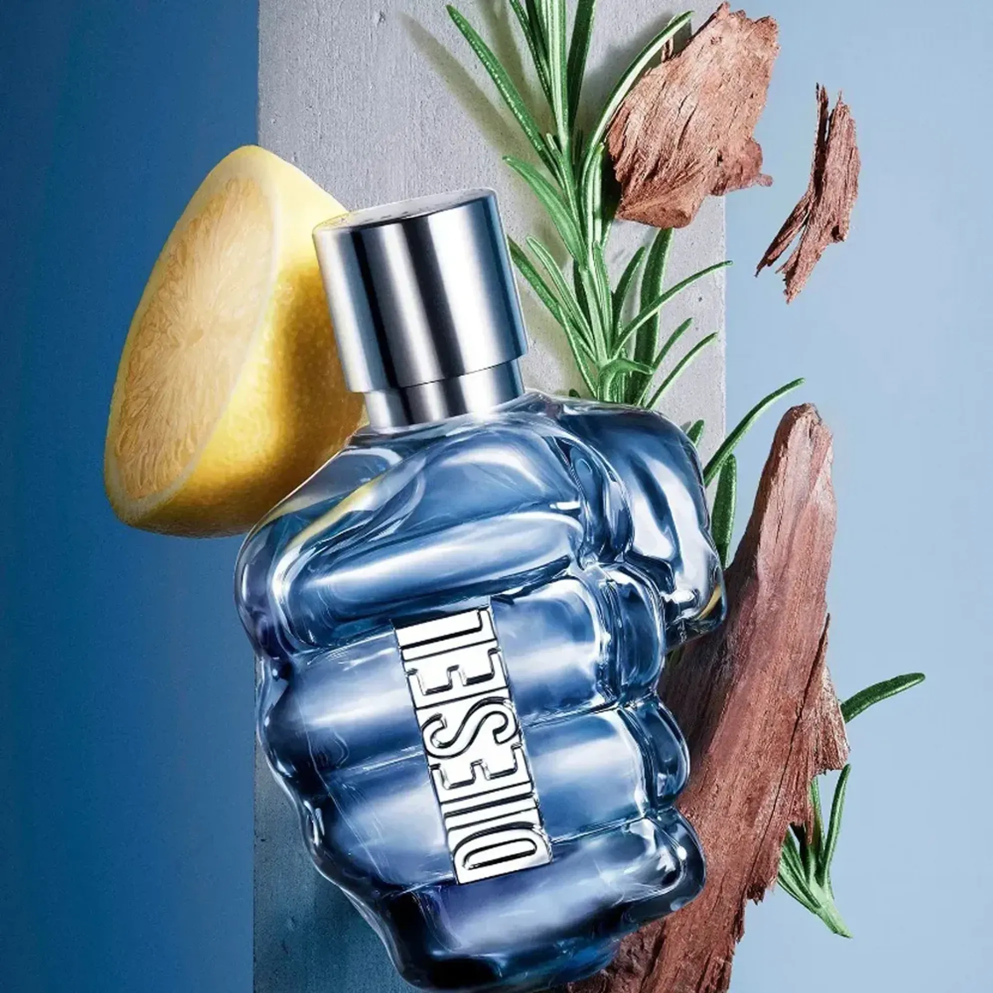 Hình dáng của chai nước hoa này thực sự là một tác phẩm điêu khắc bằng thủy tinh, giống như một nắm tay, với màu xám xanh và một chiếc nhẫn bạc khắc tên thương hiệu Diesel.