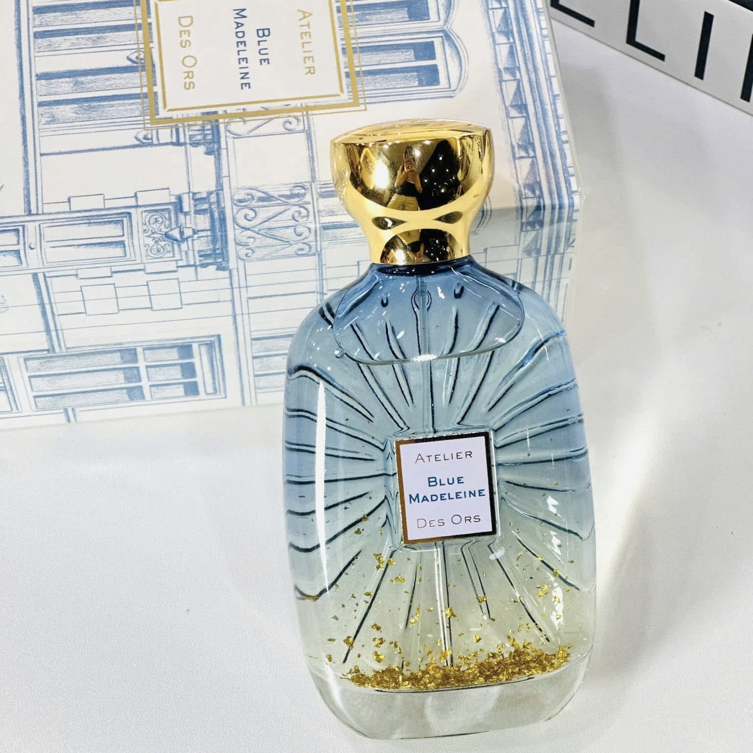 Không chỉ gây ấn tượng với mùi hương, Blue Madeleine còn sở hữu thiết kế chai vô cùng sang trọng. Chai nước hoa được làm từ thủy tinh trong suốt, để lộ chất lỏng màu xanh dịu bên trong, tượng trưng cho sự thanh lịch và nhẹ nhàng. Điểm nhấn đặc biệt là những mảnh vàng 24K lấp lánh, một đặc trưng trong thiết kế của Atelier des Ors, tạo nên vẻ xa hoa và đẳng cấp. Nắp chai ánh kim sang trọng hoàn thiện tổng thể thiết kế, khiến Blue Madeleine không chỉ là một mùi hương đáng sở hữu mà còn là một tác phẩm nghệ thuật đầy tinh tế.